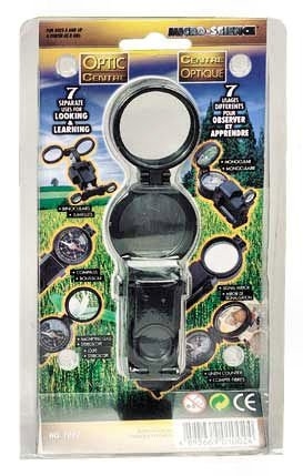 This is a multi-functional optic tool for looking and learning. Consists of Binoculars, Monocular, Mini Flashlight, Compass, Signal Mirror, Whistle, Linen Counter, Magnifying Glass & Stereoscope.