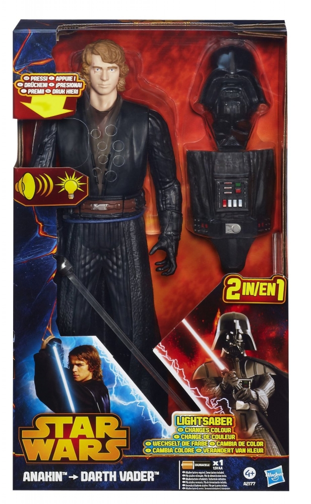 Ultimate Darth Vader introduces a breakthrough action figure innovation to celebrate the rise of Darth Vader with the Star Wars Anakin to Darth Vader figure. Standing at 13-inches tall, this figure changes from Anakin Skywalker to Darth Vader by attaching the helmet and armor, and includes iconic movie phrases, sound effects, and a Lightsaber that changes from blue to red. Starwars® © & ™ Lucasfilm Ltd. All rights reserved.