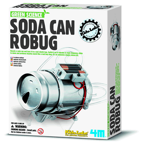Recycle a soda can and turn it into a cool robotic bug. Switch it on and watch it vibrate causing it to slide across the floor. It even emits a "buzz" as it moves along - just like a real bug.It's an awesomerobotic science kit.