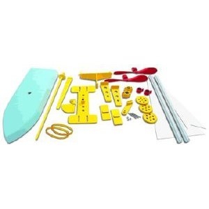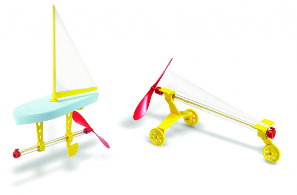This product is endorsed by the London Science Museum. Build vehicles powered by the energy stored in stretched elastic. Propellers make use of the third law of motion "for every action ona na object there is an equal, but oppersite reaction". In other words, any force is balanced by another one in the oppersite direction. As the wound-up elasic unwinds itself it turns a propeller. The kit uses this motion to power a cart and a boat.